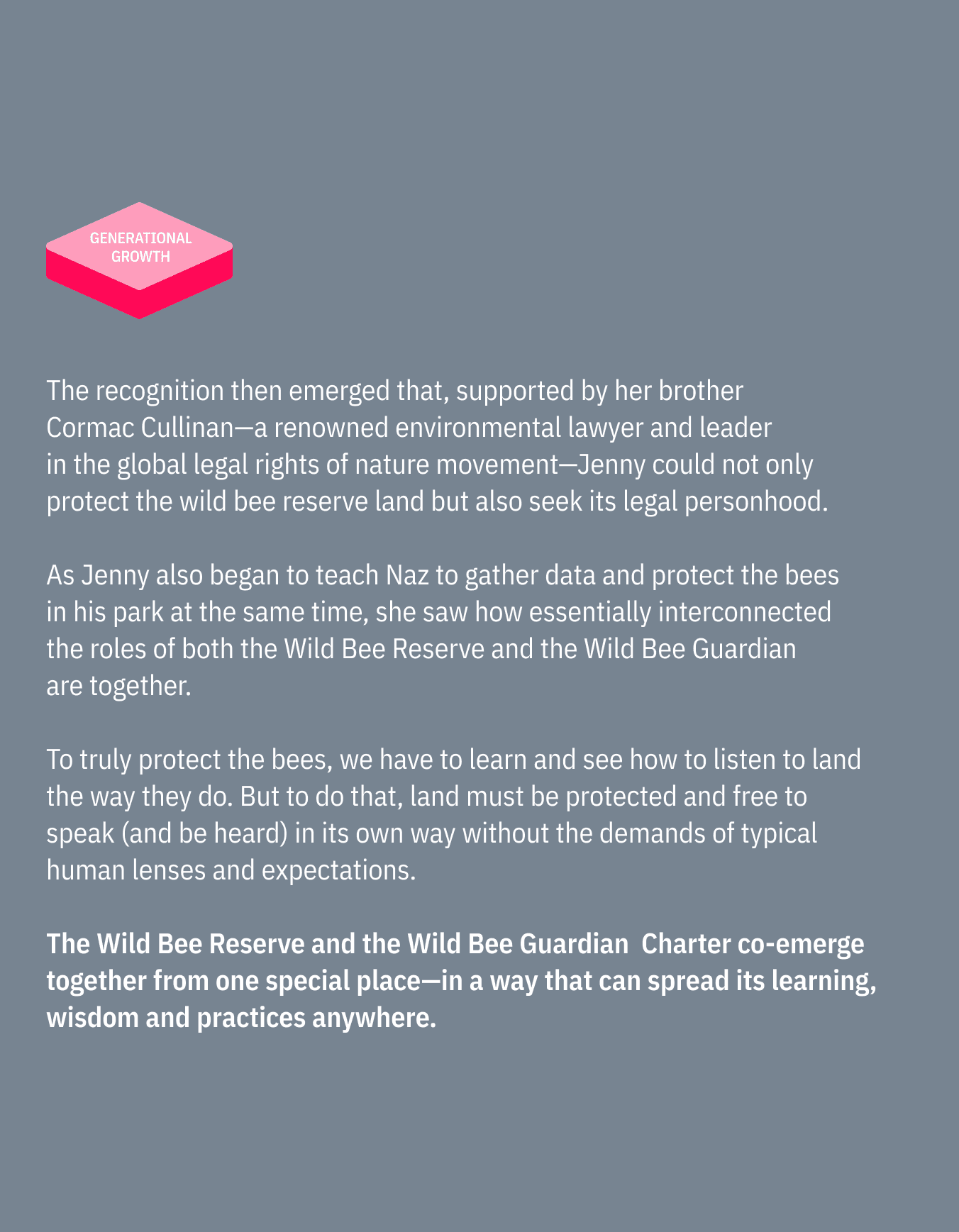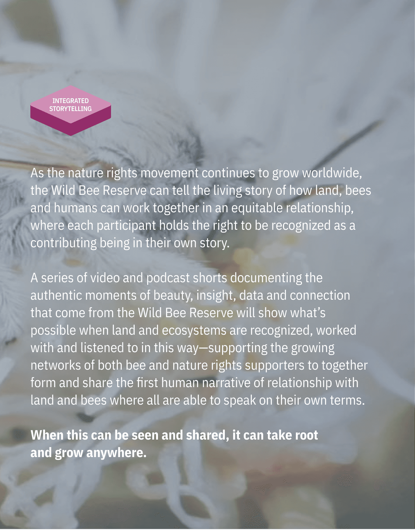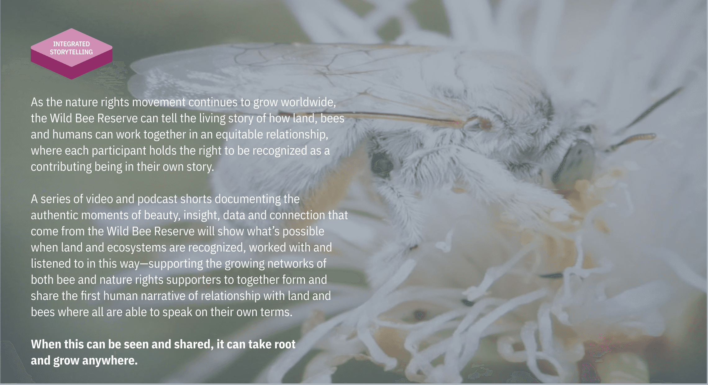The Wild Bee Reserve is about more than just establishing the world's first conservation space for wild bees. It's about creating a sovereign space where the relationship between land, humans and all beings can be reimagined and reorganized to form the heart of new research and practices— as taught by one of our planet’s most evolved collaborative species.